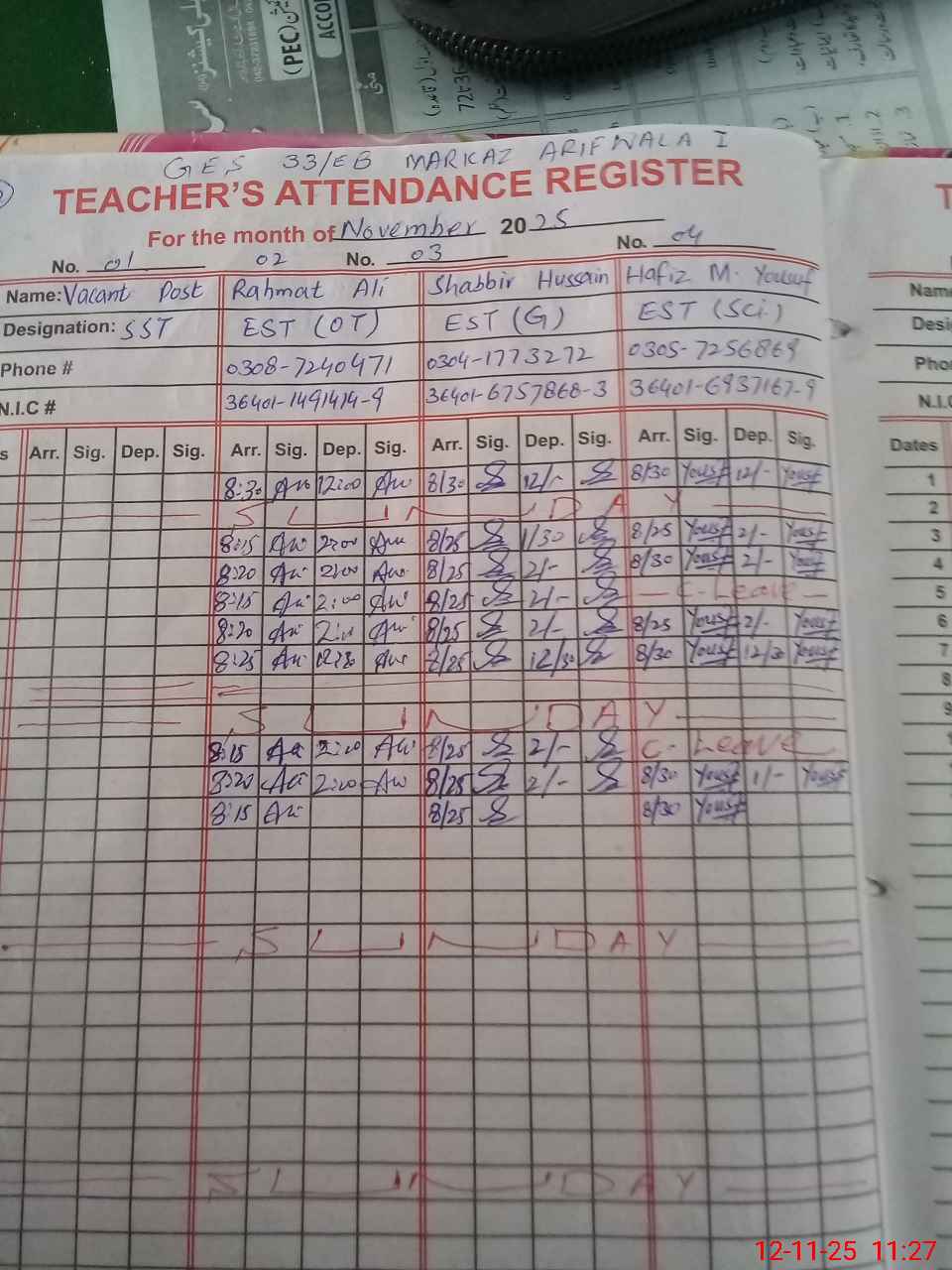 | CNIC | Full Name | Designation | R/C | Absence During Last Calender Month |