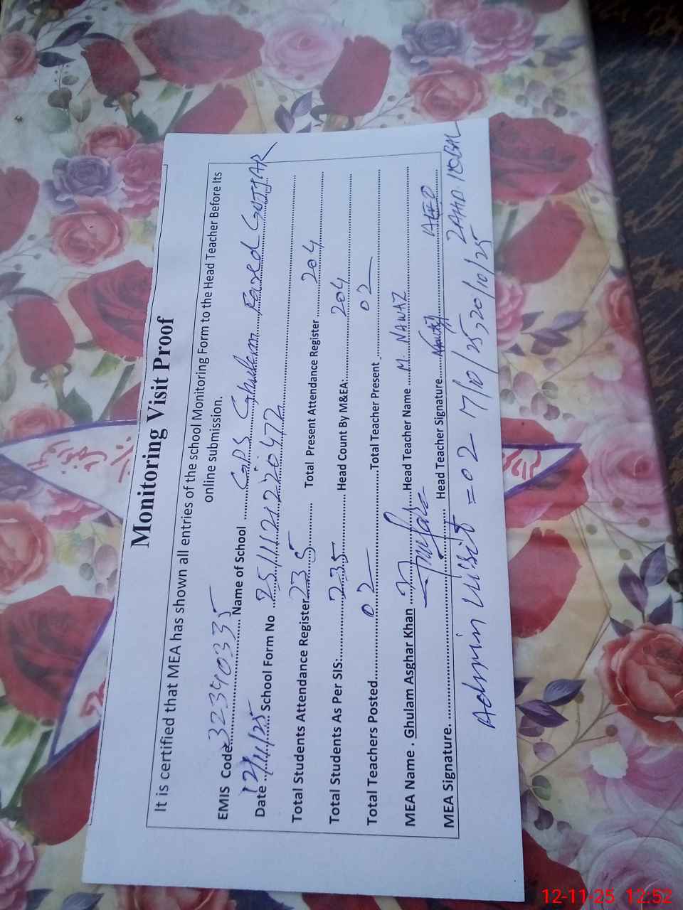 | Attendance Register | Head Teacher | MEA with School | Visit Proof |