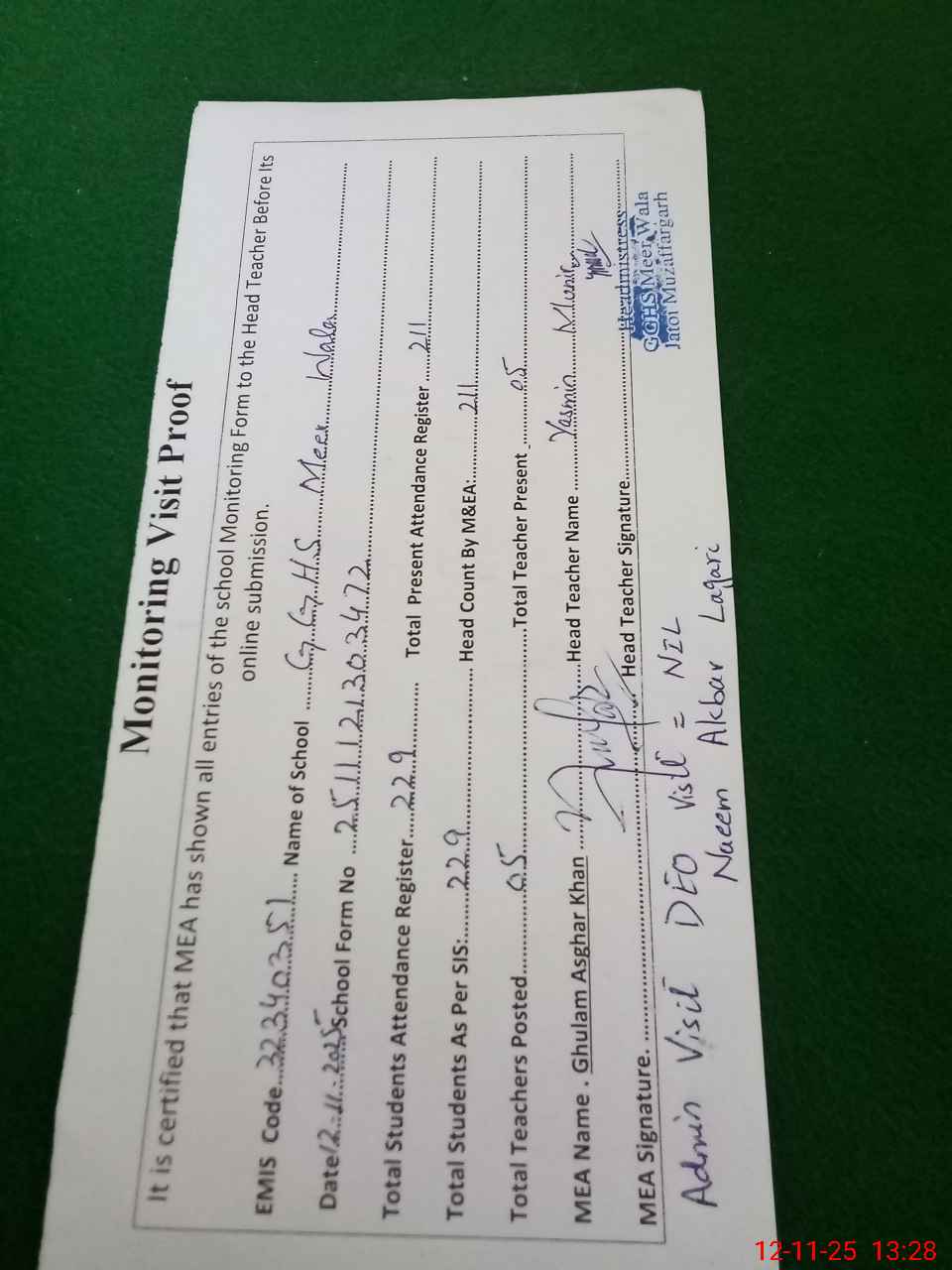 | Attendance Register | Head Teacher | MEA with School | Visit Proof |