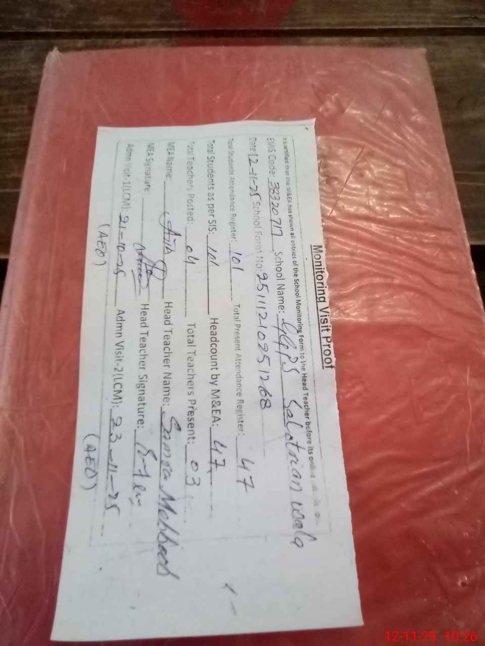 | Attendance Register | Head Teacher | MEA with School | Visit Proof |