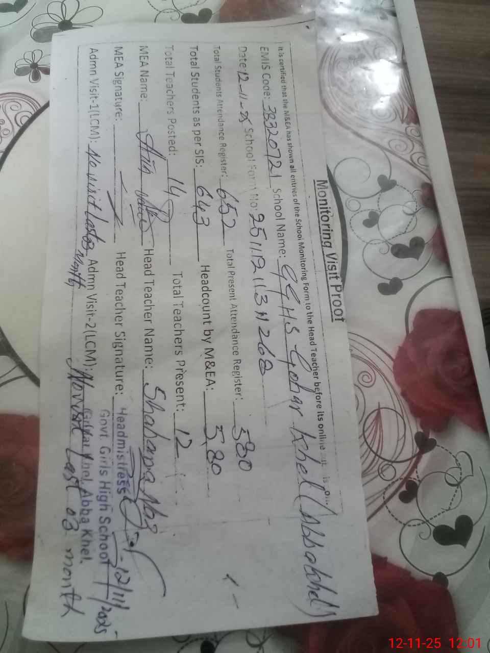| EMIS Code: 38320721 | Name of School: GGHS GOHAR KHEL ABBA KHEL | |||