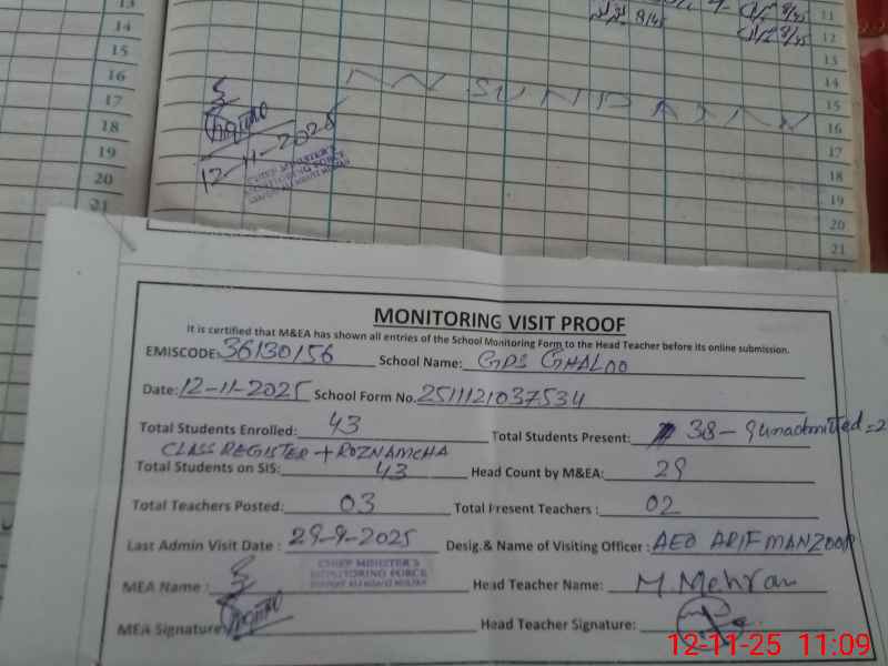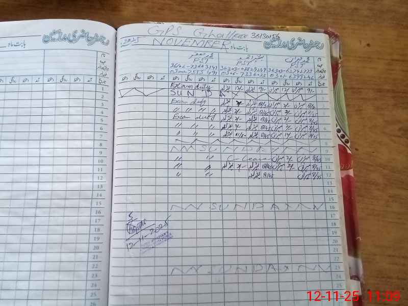 | Total no. of Classrooms: 2 No. of Classrooms Used for Teaching: 2 No. of Classrooms Storing Old Furniture, FTBs, etc: 0Comments if Any: SIS APP NOT OPENING DUE TO VERY POOR SIGNAL SO STUDENTS ATTENDENCE CHECKED BY CLASS ATTENDENCE AND ROZNAMCHA REGISTER PST MUHAMMAD JAFFAR MARKED ON EXAM DUTY WITHOUT ANY PROOF SO HE US ABSENT TODAY |