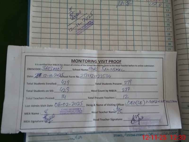| EMIS Code: 36130009 | Name of School: GHS SANBHAL P/O JHOKE WAINS MULTAN | |||