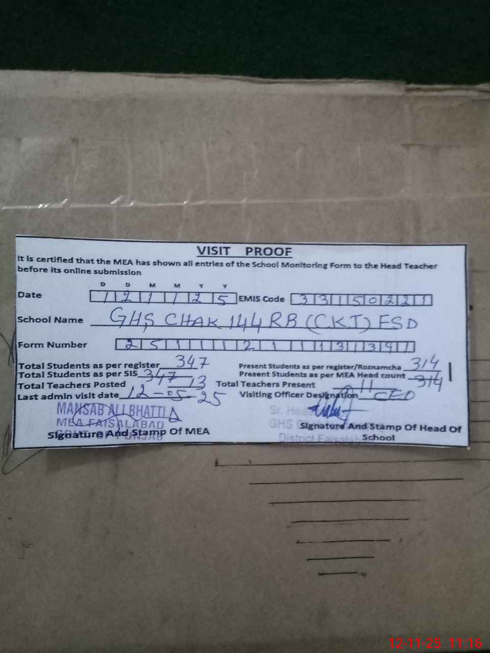 | Attendance Register | Head Teacher | MEA with School | Visit Proof |