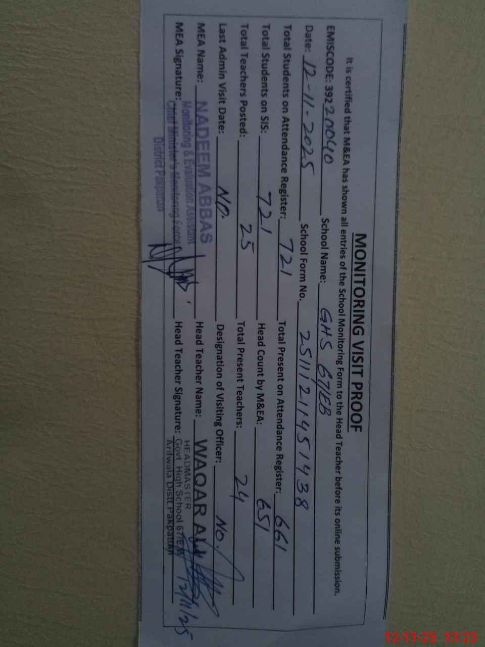 | Attendance Register | Head Teacher | MEA with School | Visit Proof |