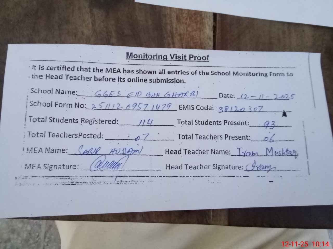 | Remarks (Use Separate Page if Required): Last visit by AEO ZAHRA SAFDAR on 20 10 2025 | |||||
