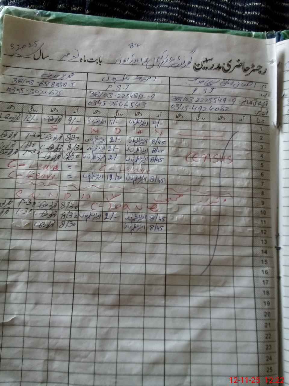 | CNIC | Full Name | Designation | R/C | Absence during last cal. month |