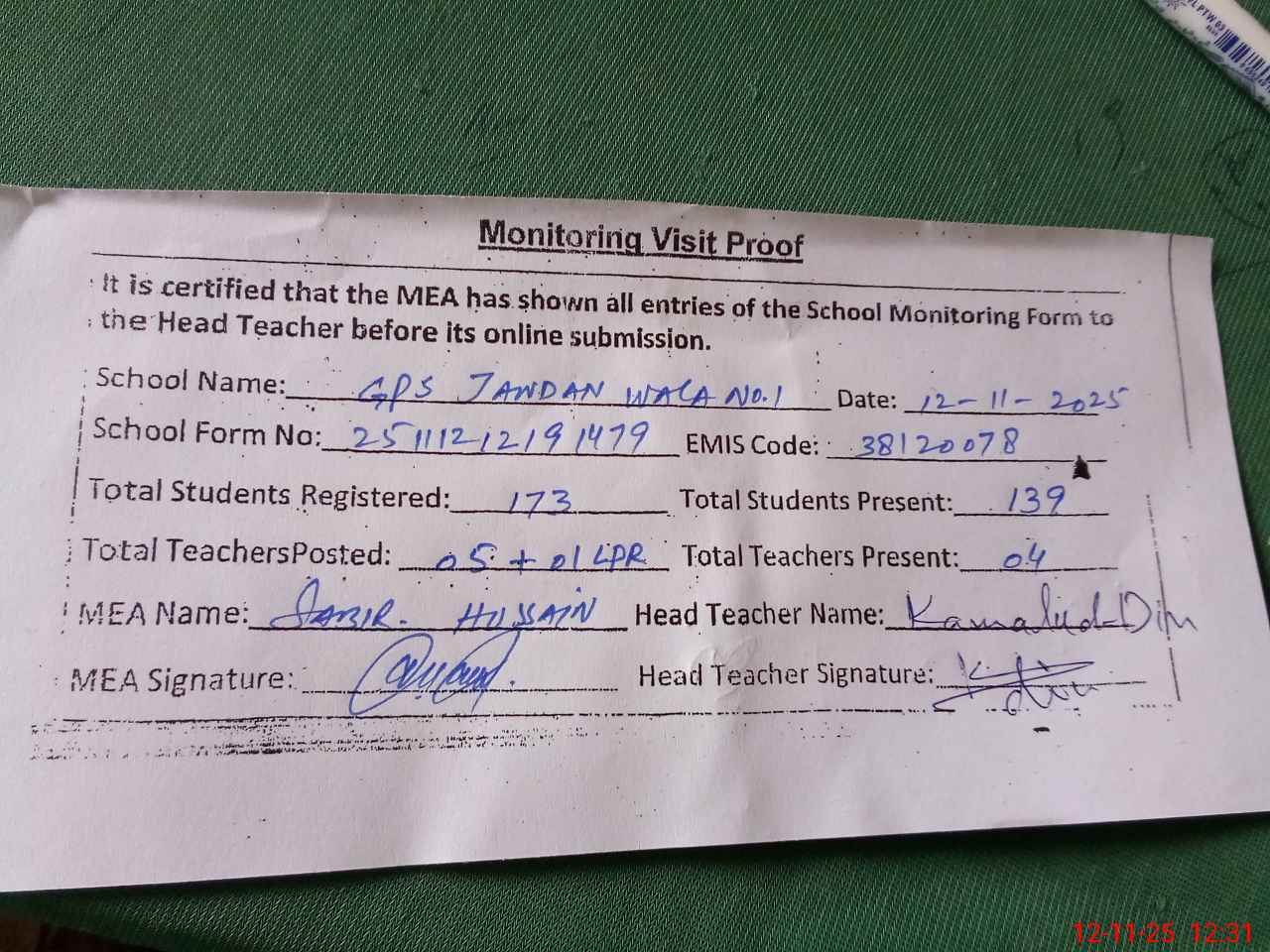 | Remarks (Use Separate Page if Required): Last visit by AEO MUHAMMAD ASLAM on 31 10 2025 | |||||