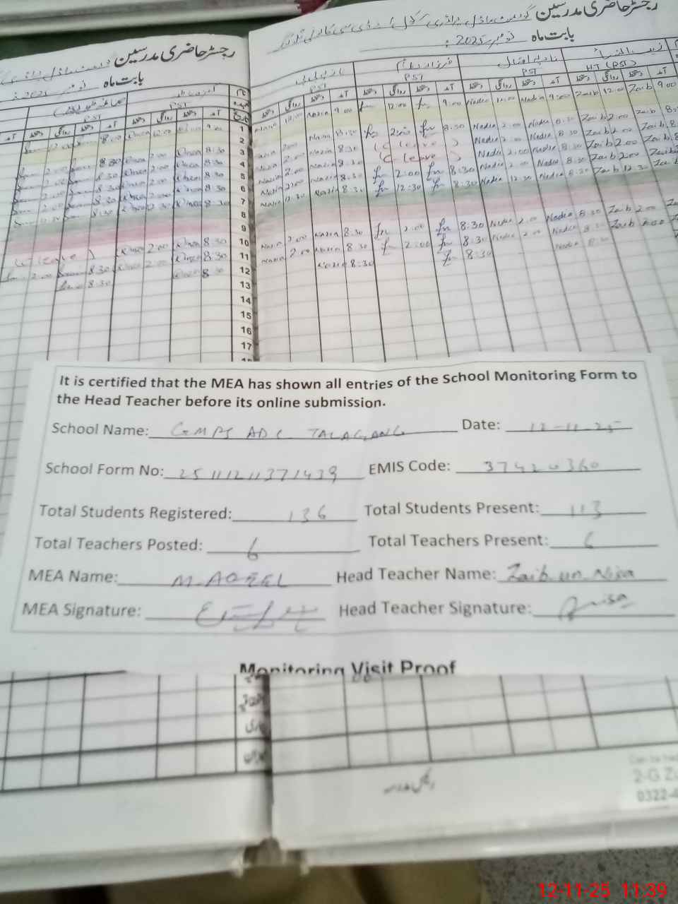 | Attendance Register | Head Teacher | MEA with School | Visit Proof |
