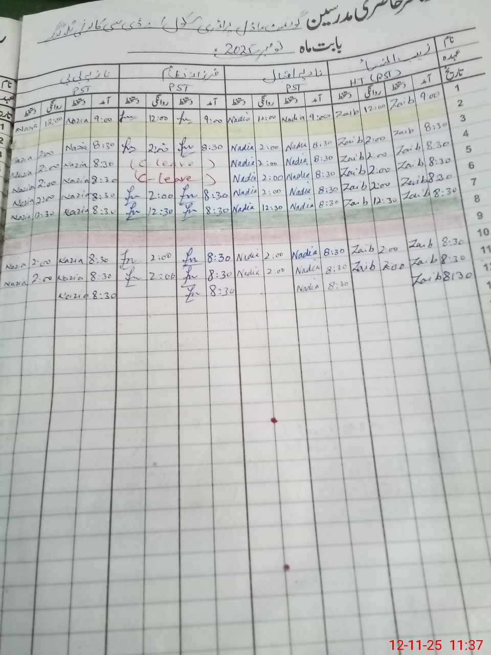 | CNIC | Full Name | Designation | R/C | Absence During Last Calender Month |