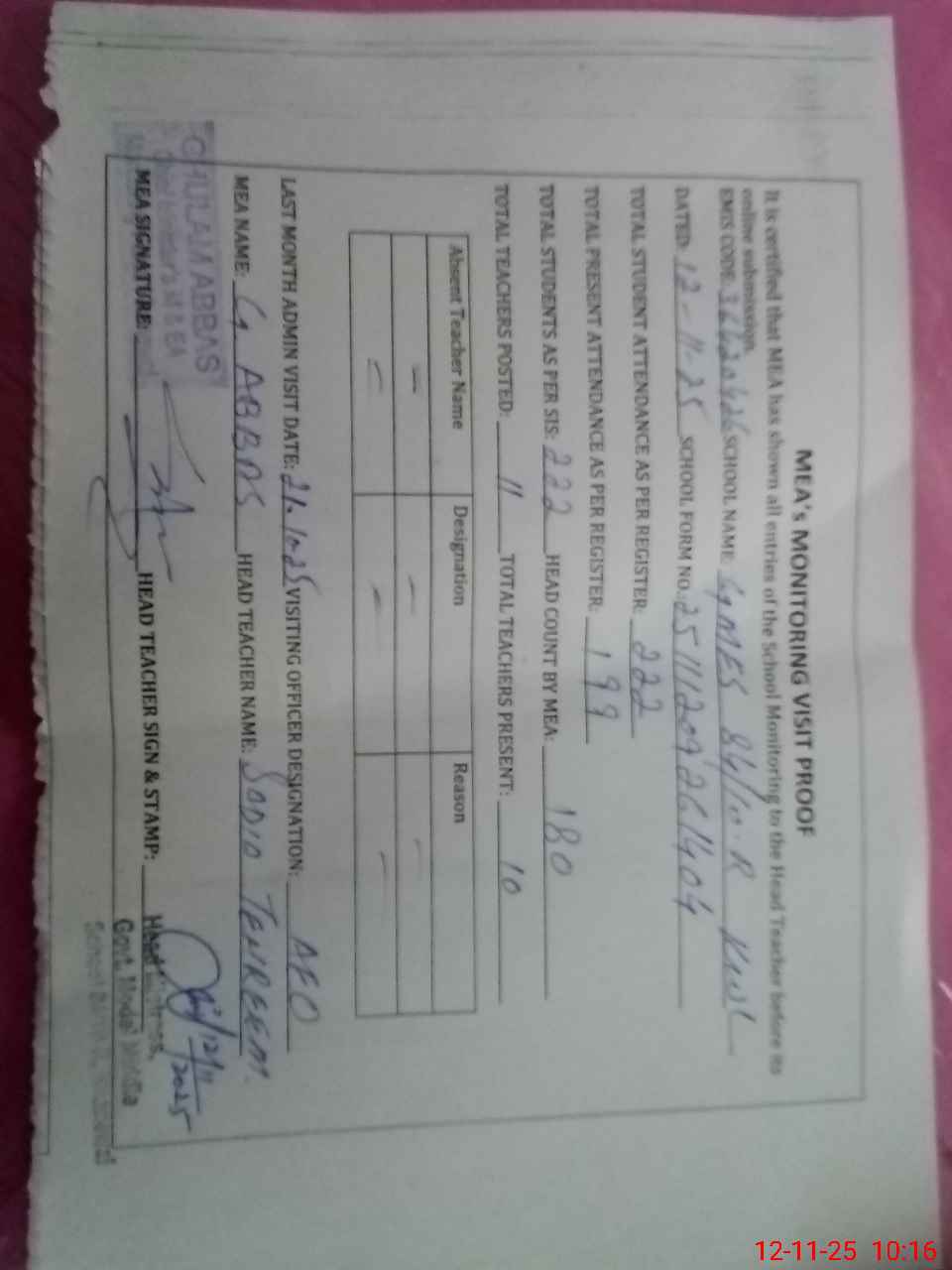 | Certified that this School was Inspected by the Undersigned MEA/DMO Today and the Information Stated Above is as Per Record. | |||||