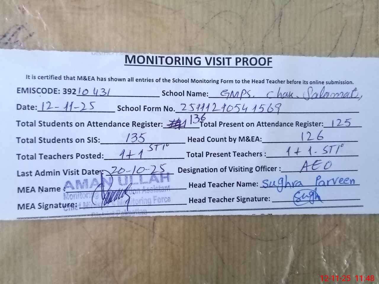 | Attendance Register | Head Teacher | MEA with School | Visit Proof |