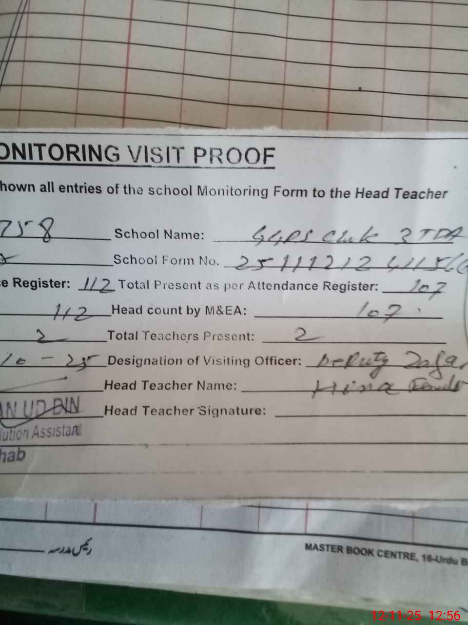 | Remarks (Use Separate Page if Required): Ggps no 3 tda Student on sis 112 Student on register 112 Head count 107 No teacher absent Last visit deputy Zafar 10 Oct Aeo is not assigned | |||||