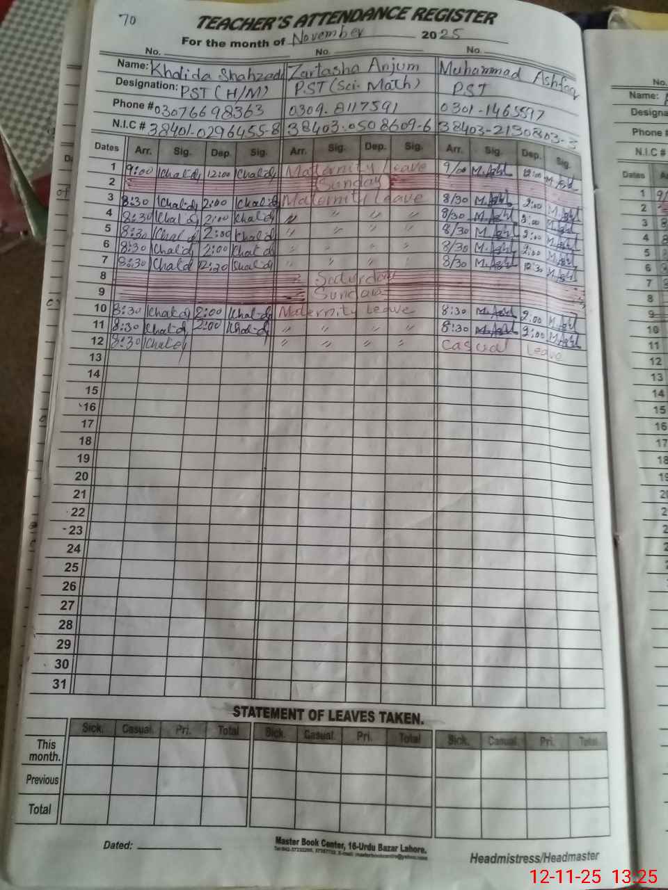 | CNIC | Full Name | Designation | R/C | Absence During Last Calender Month |