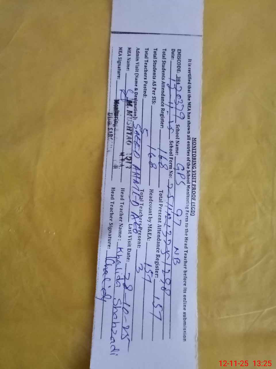| Attendance Register | Head Teacher | MEA with School | Visit Proof |