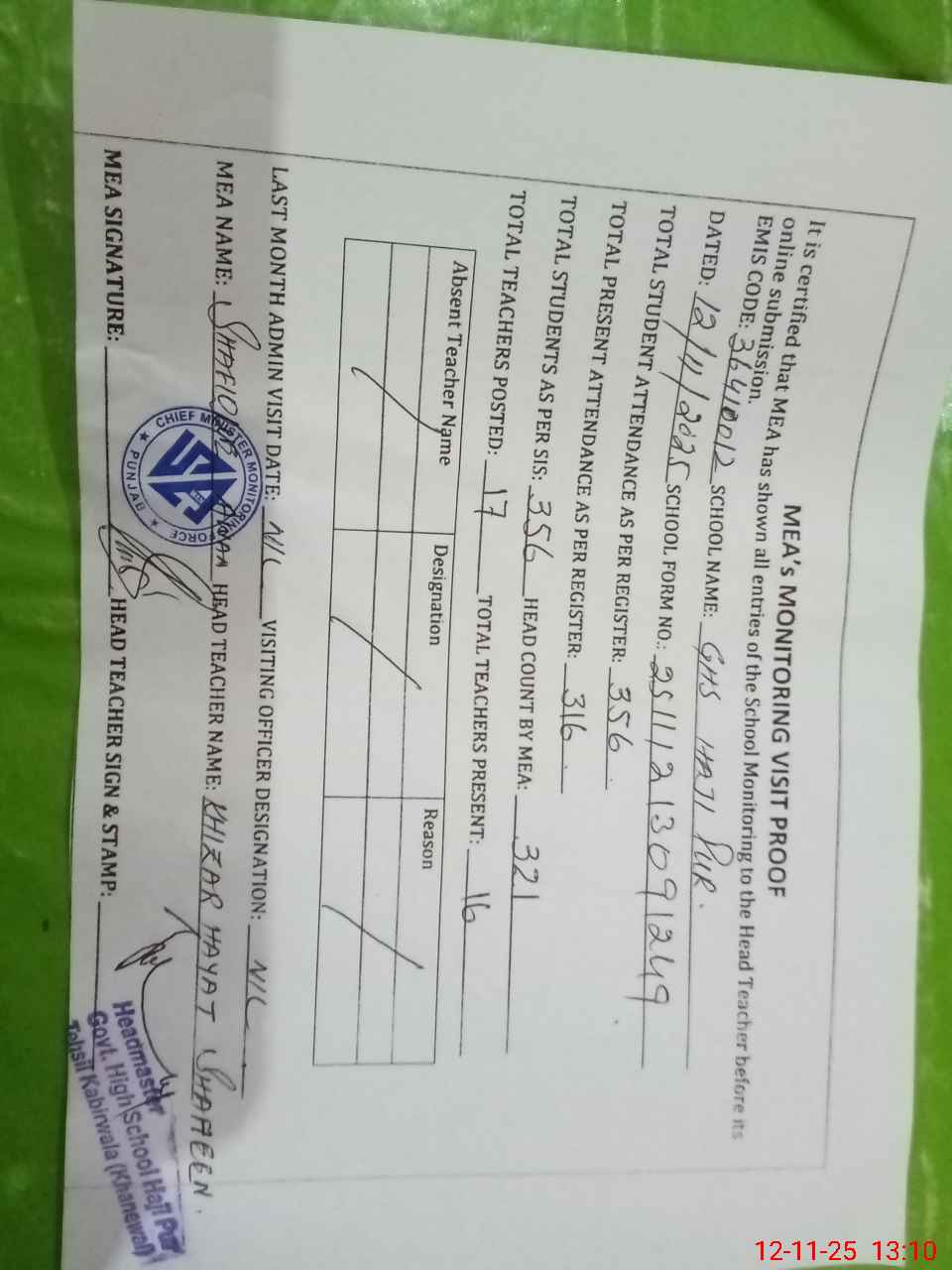| EMIS Code: 36410012 | Name of School: GHS HAJI PUR, KABIRWALA | |||