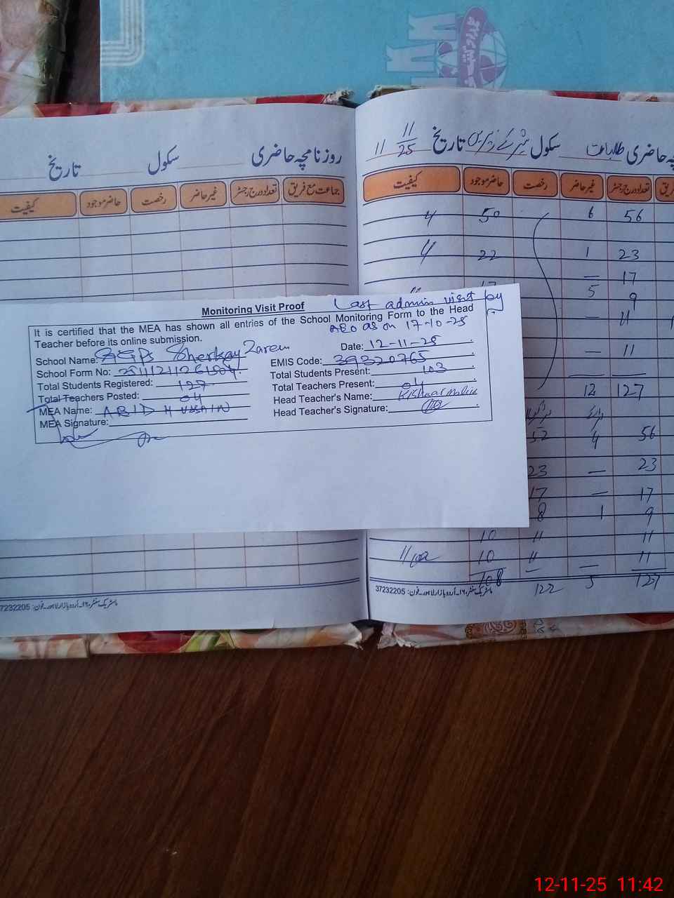 | Attendance Register | Head Teacher | MEA with School | Visit Proof |