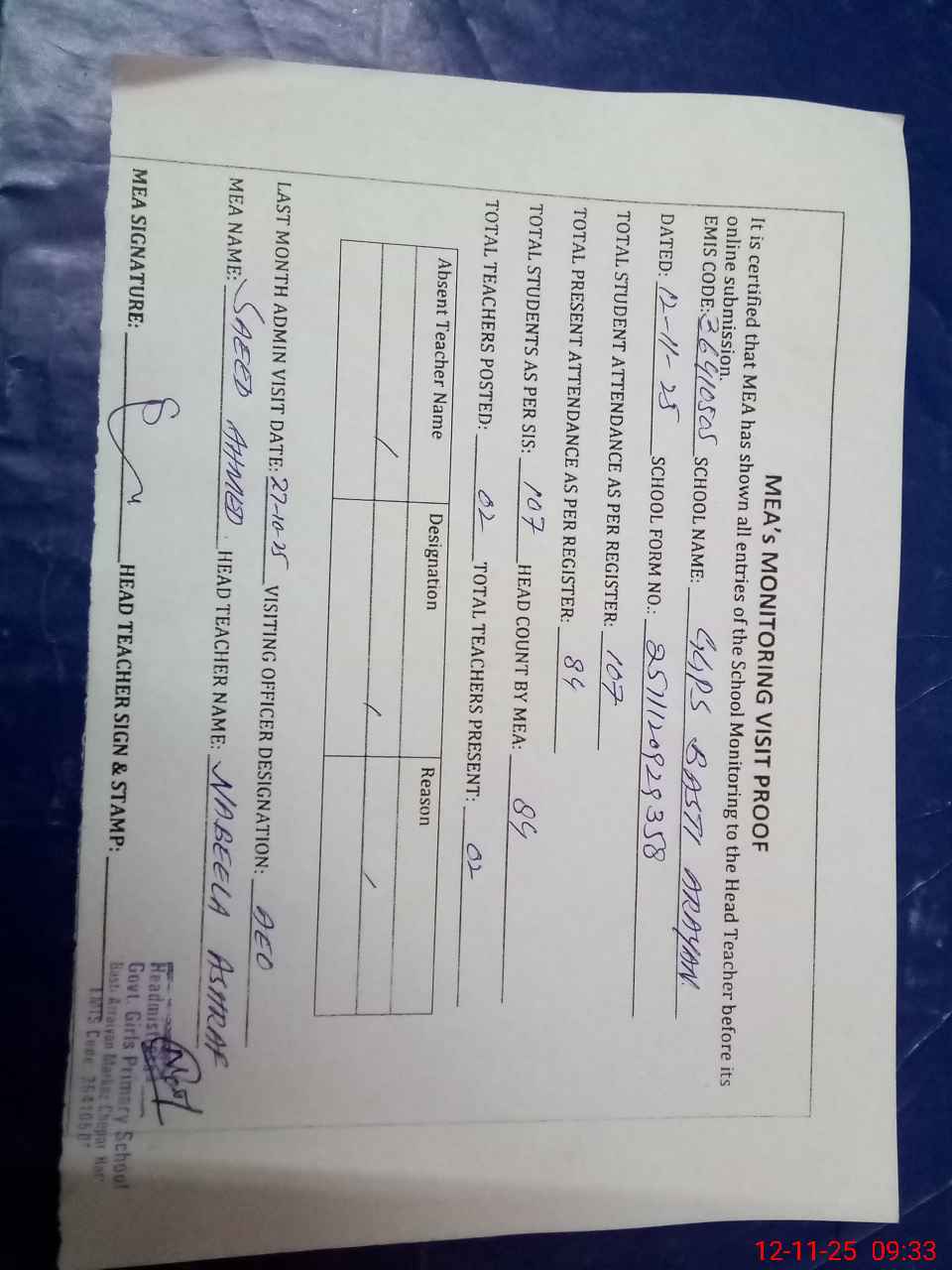 | Monitoring Date: 12-11-2025 | Start Time: 12-11-2025 09:01 AM | End Time: 12-11-2025 09:36 AM | Name of MEA: Sa**** Ah**** | |