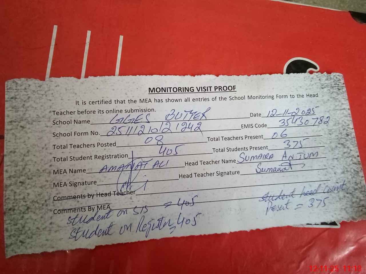 | Attendance Register | Head Teacher | MEA with School | Visit Proof |