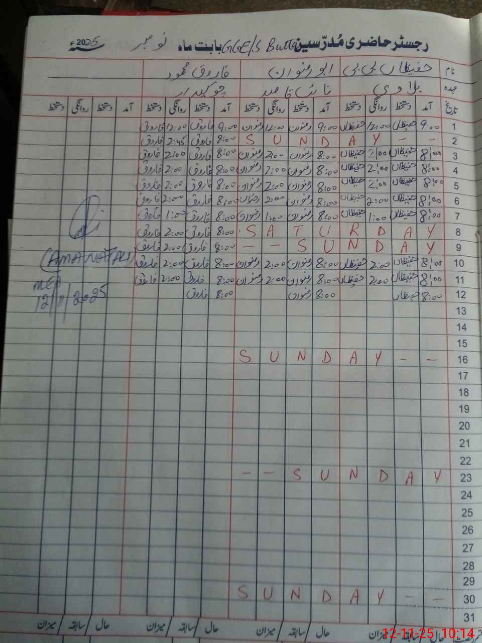 | CNIC | Full Name | Designation | R/C | Absence During Last Calender Month |