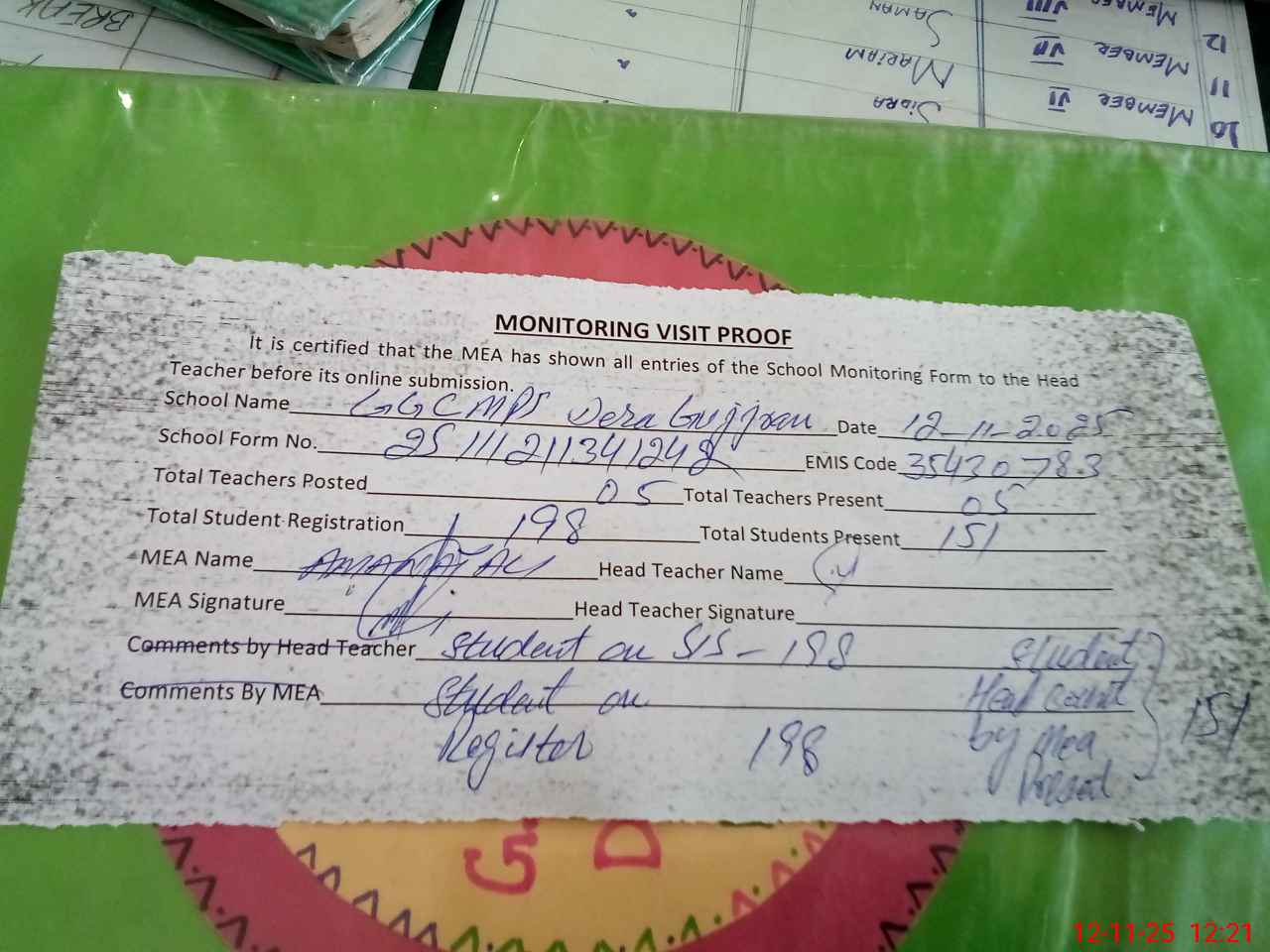 | Attendance Register | Head Teacher | MEA with School | Visit Proof |