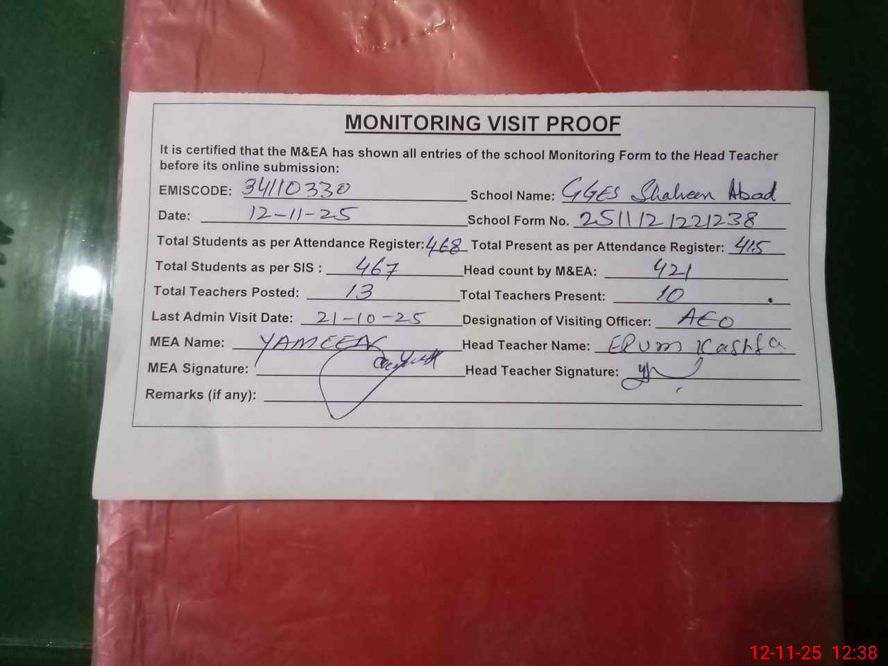| EMIS Code: 34110330 | Name of School: GGES SHAHEEN ABAD | |||