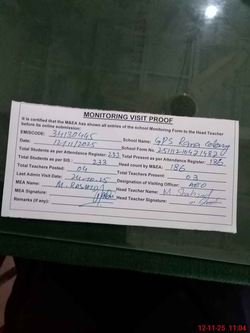 | Attendance Register | Head Teacher | MEA with School | Visit Proof |