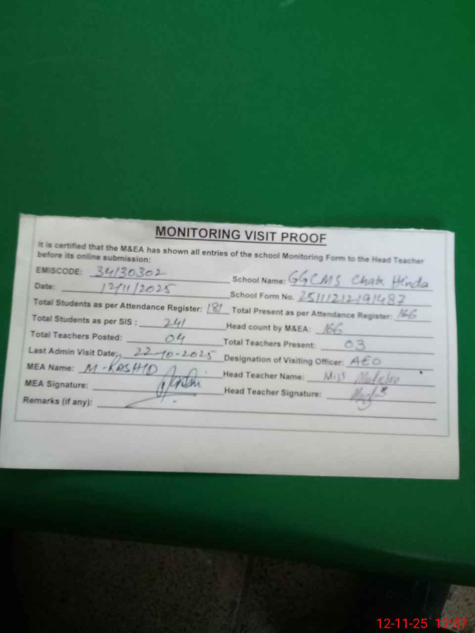 | Attendance Register | Head Teacher | MEA with School | Visit Proof |