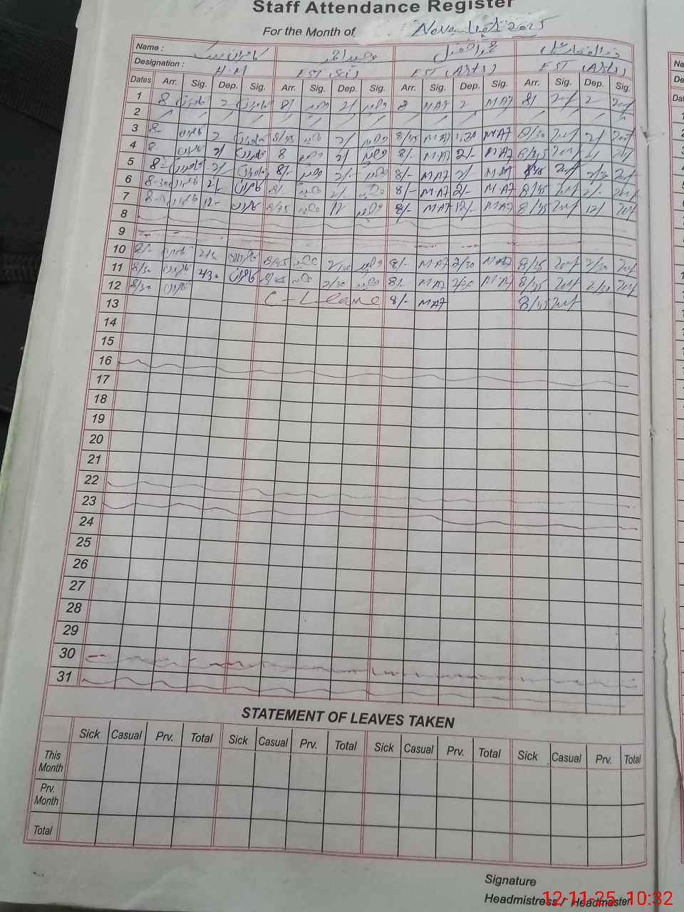 | CNIC | Full Name | Designation | R/C | Absence During Last Calender Month |
