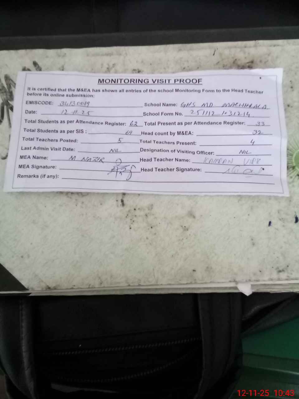 | Attendance Register | Head Teacher | MEA with School | Visit Proof |