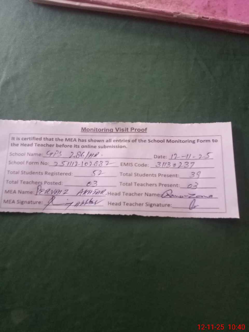 | Attendance Register | Head Teacher | MEA with School | Visit Proof |