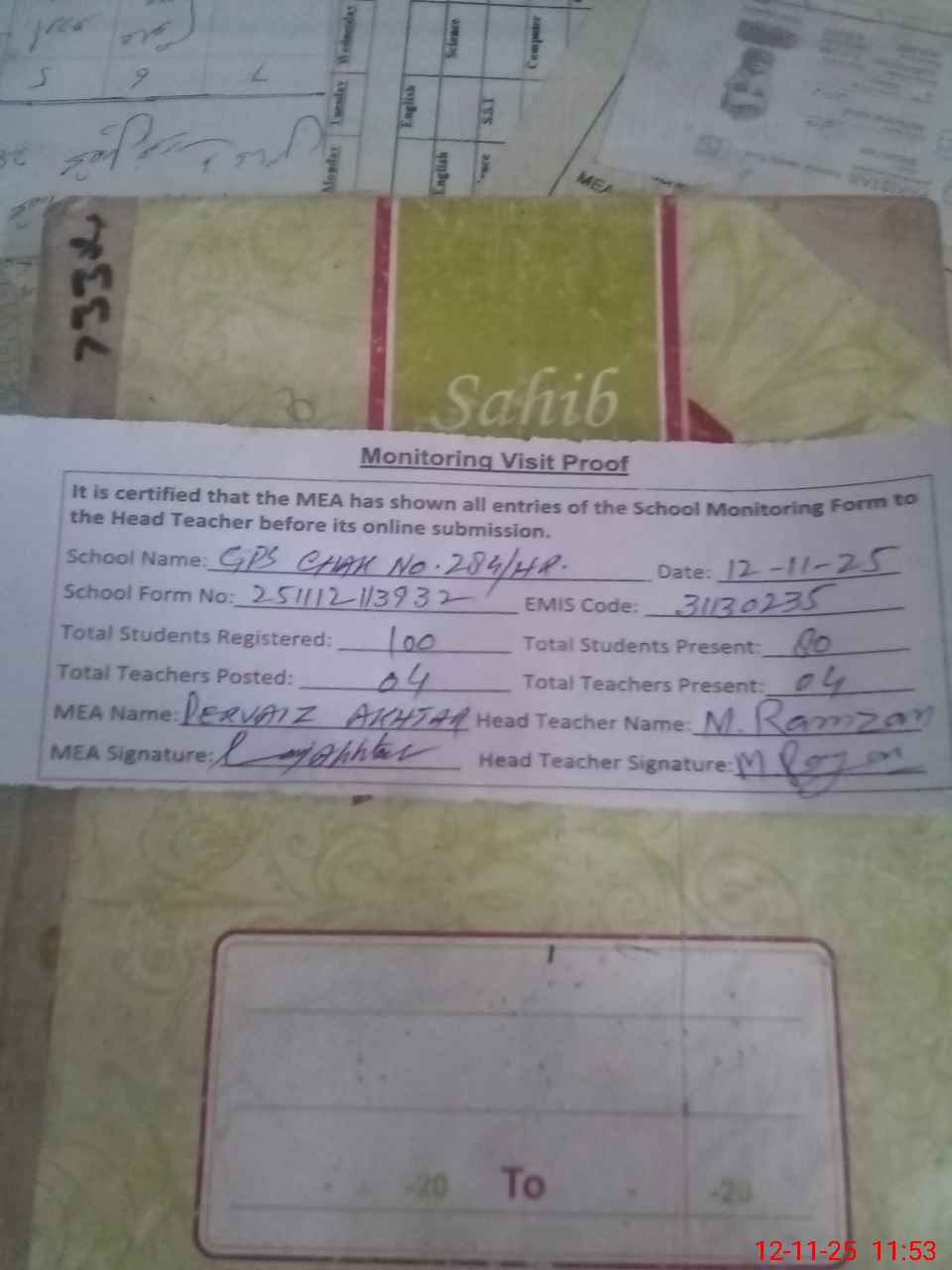 | EMIS Code: 31130235 | Name of School: GPS CHAK NO 284 HR | |||