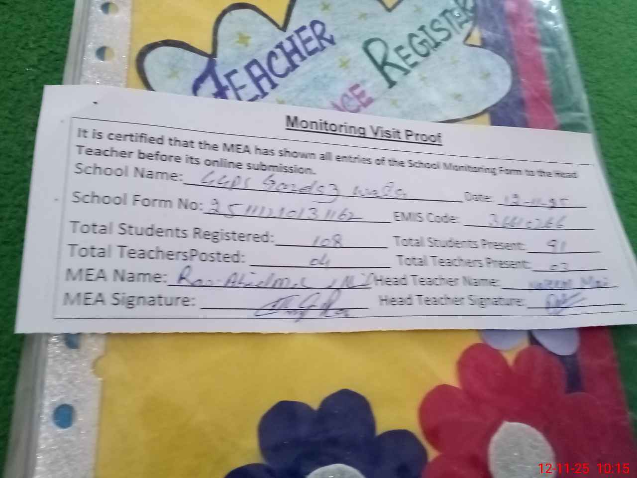| Attendance Register | Head Teacher | MEA with School | Visit Proof |