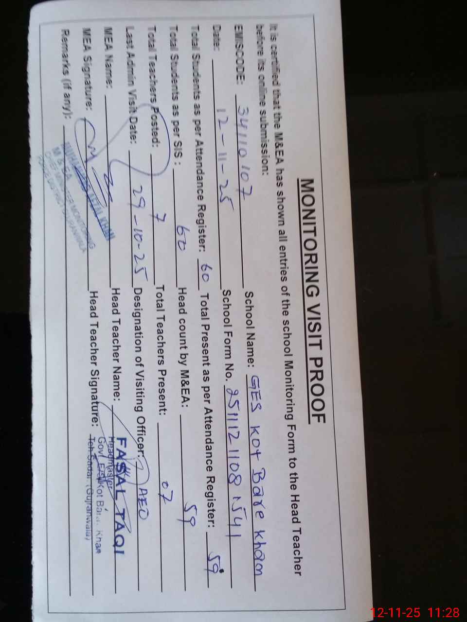 | Attendance Register | Head Teacher | MEA with School | Visit Proof |