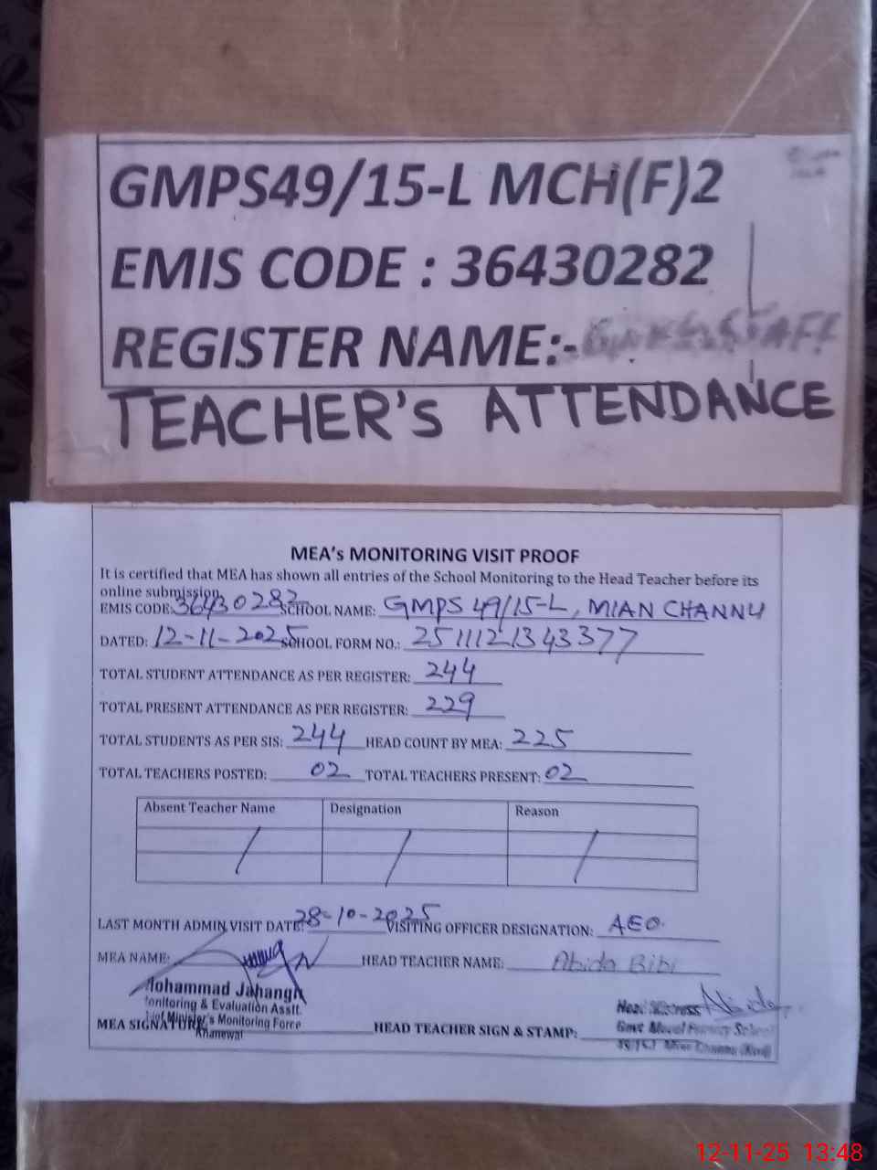 | EMIS Code: 36430282 | Name of School: GMPS 49/15-L, MIAN CHANNU | |||