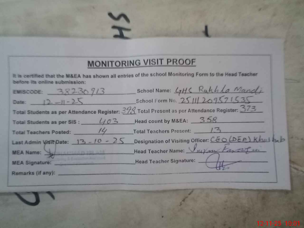| Remarks (Use Separate Page if Required): CEO visited school on 13 October 2025 Students strength on sis 403 | |||||