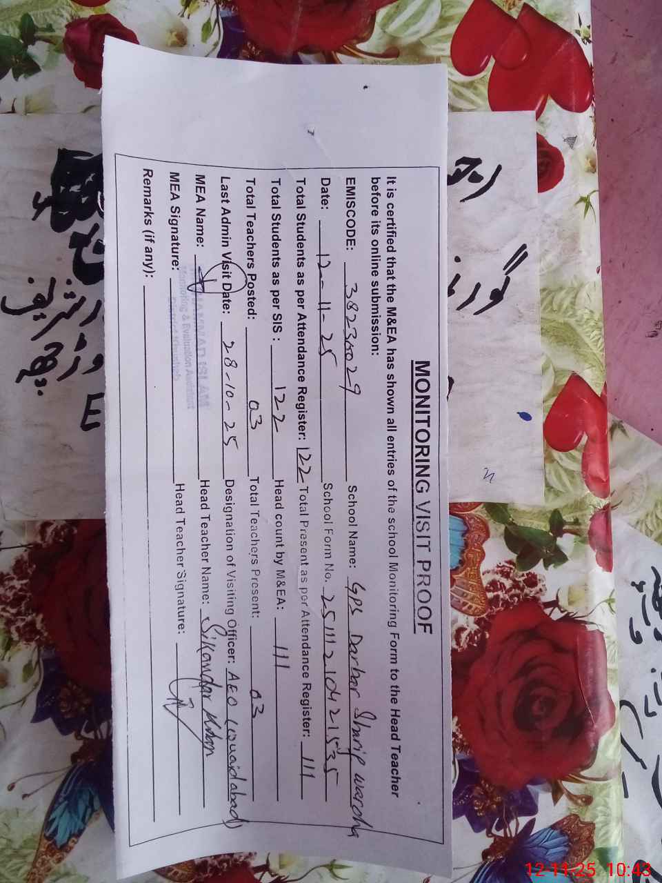 | EMIS Code: 38230029 | Name of School: GPS DARBAR SHARIF WARCHHA | |||
