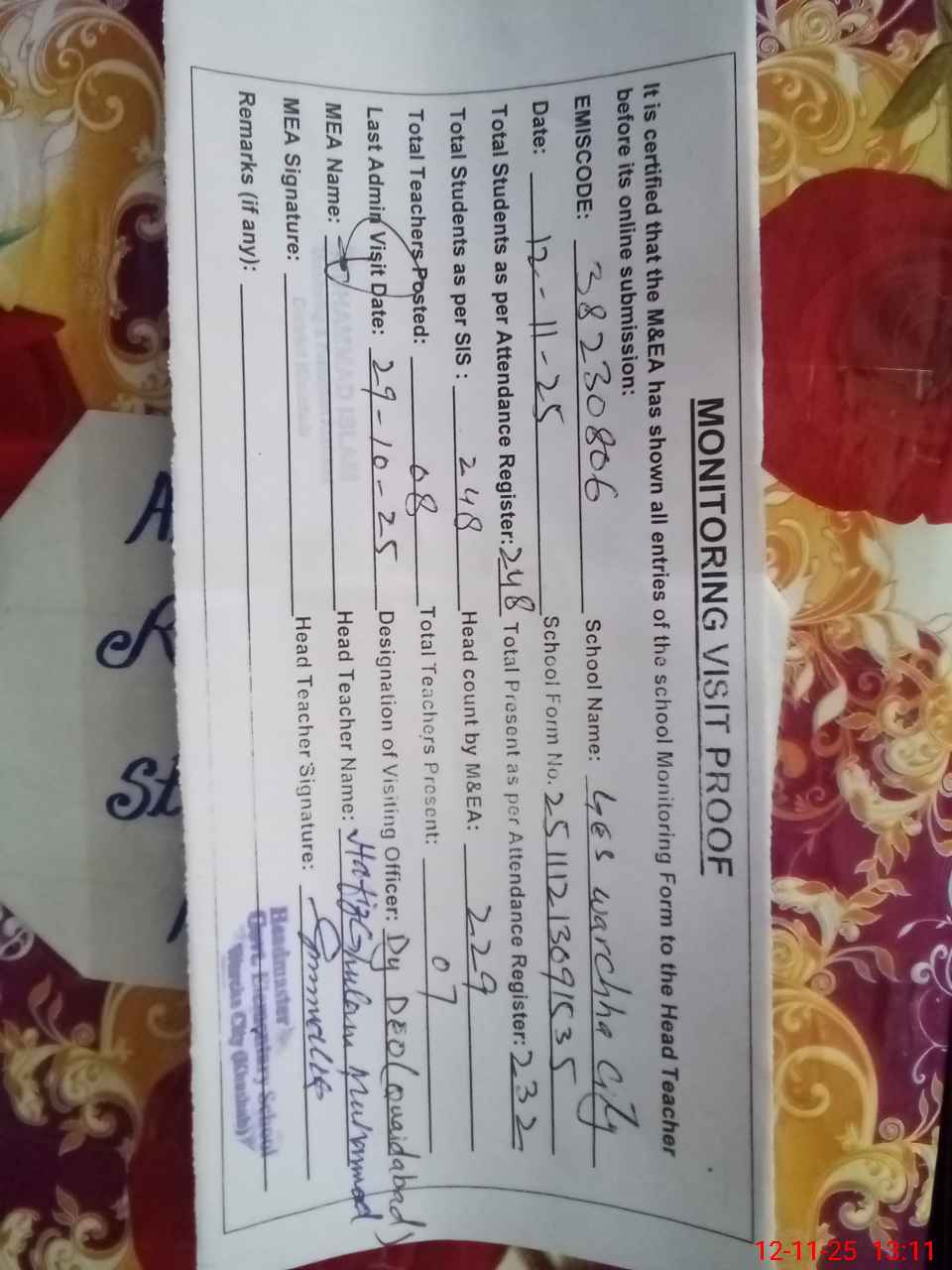 | Remarks (Use Separate Page if Required): Dy DEO visited school on 29 October 2025 Students strength on sis 248 | |||||