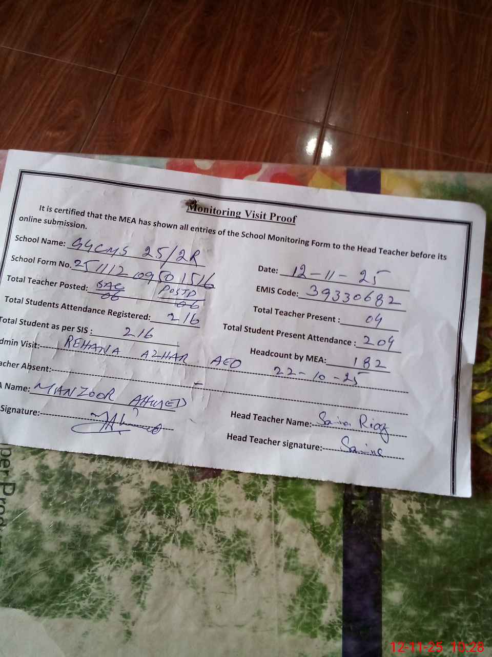 | Attendance Register | Head Teacher | MEA with School | Visit Proof |