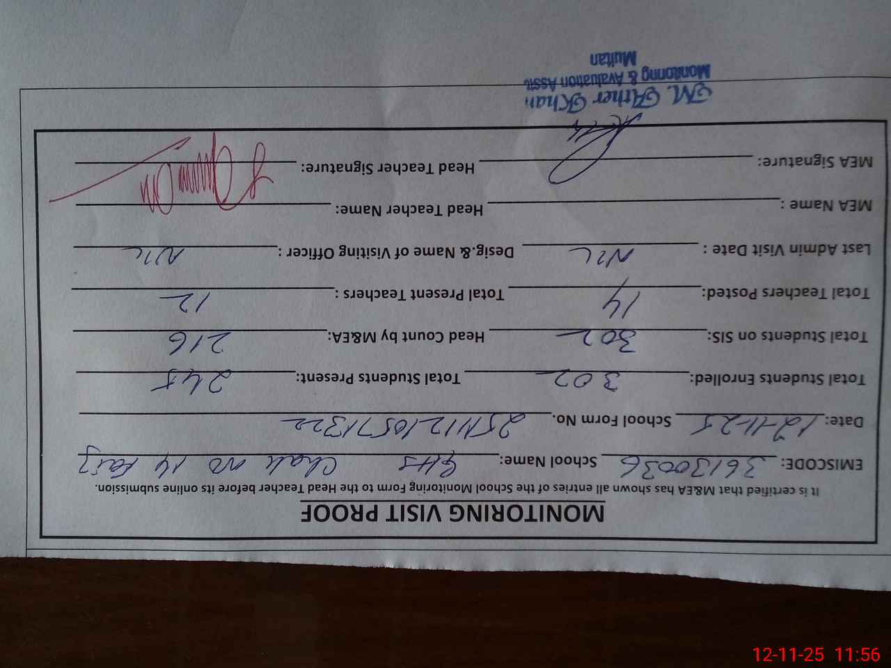| Certified that this School was Inspected by the Undersigned MEA/DMO Today and the Information Stated Above is as Per Record. | |||||