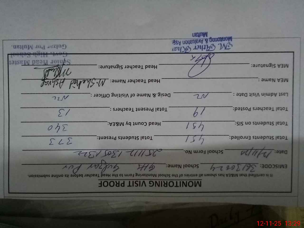 | Attendance Register | Head Teacher | MEA with School | Visit Proof |