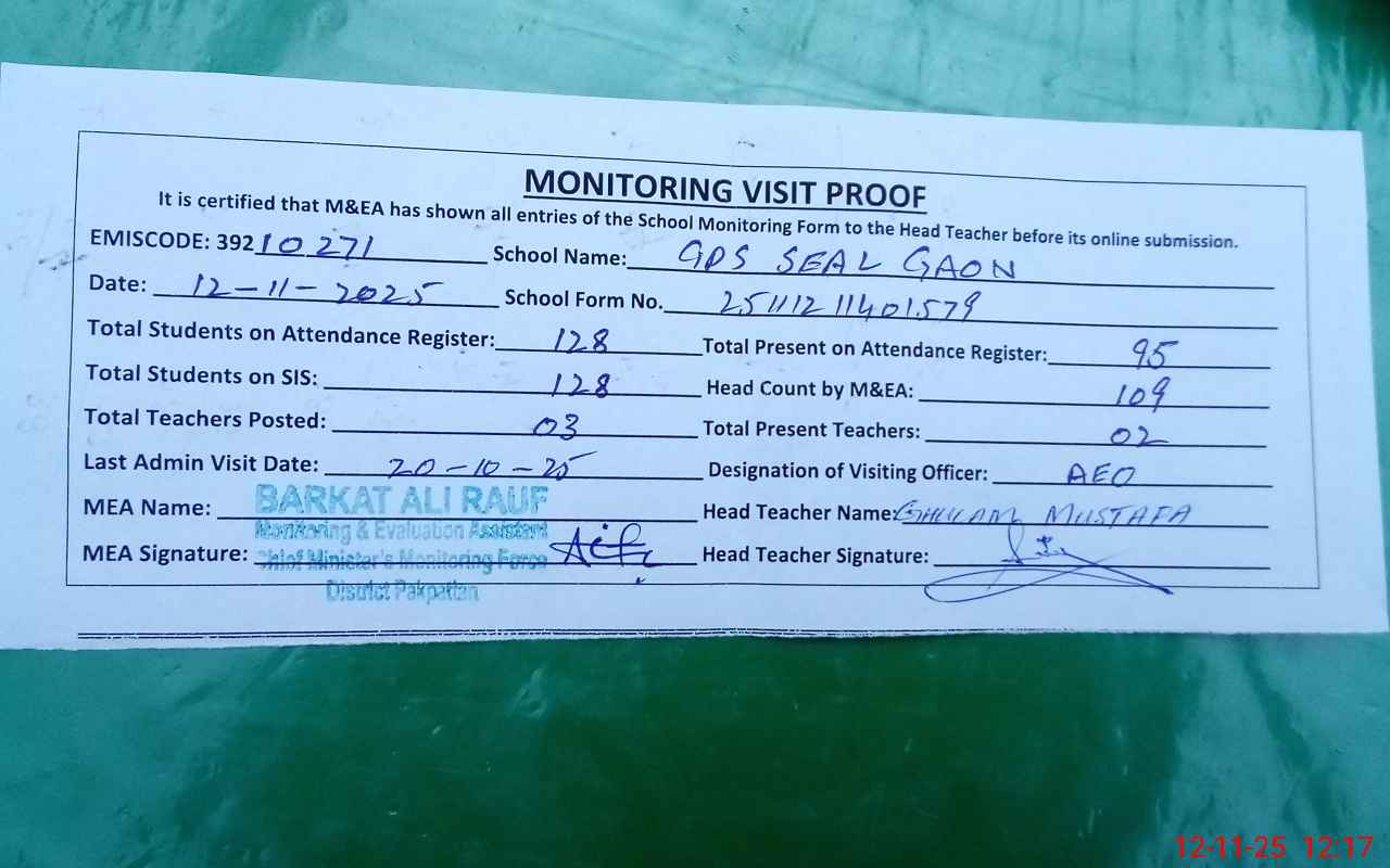 | EMIS Code: 39210271 | Name of School: GPS SEAL GAON P/O CHAK BEDI PAKPATTAN | |||