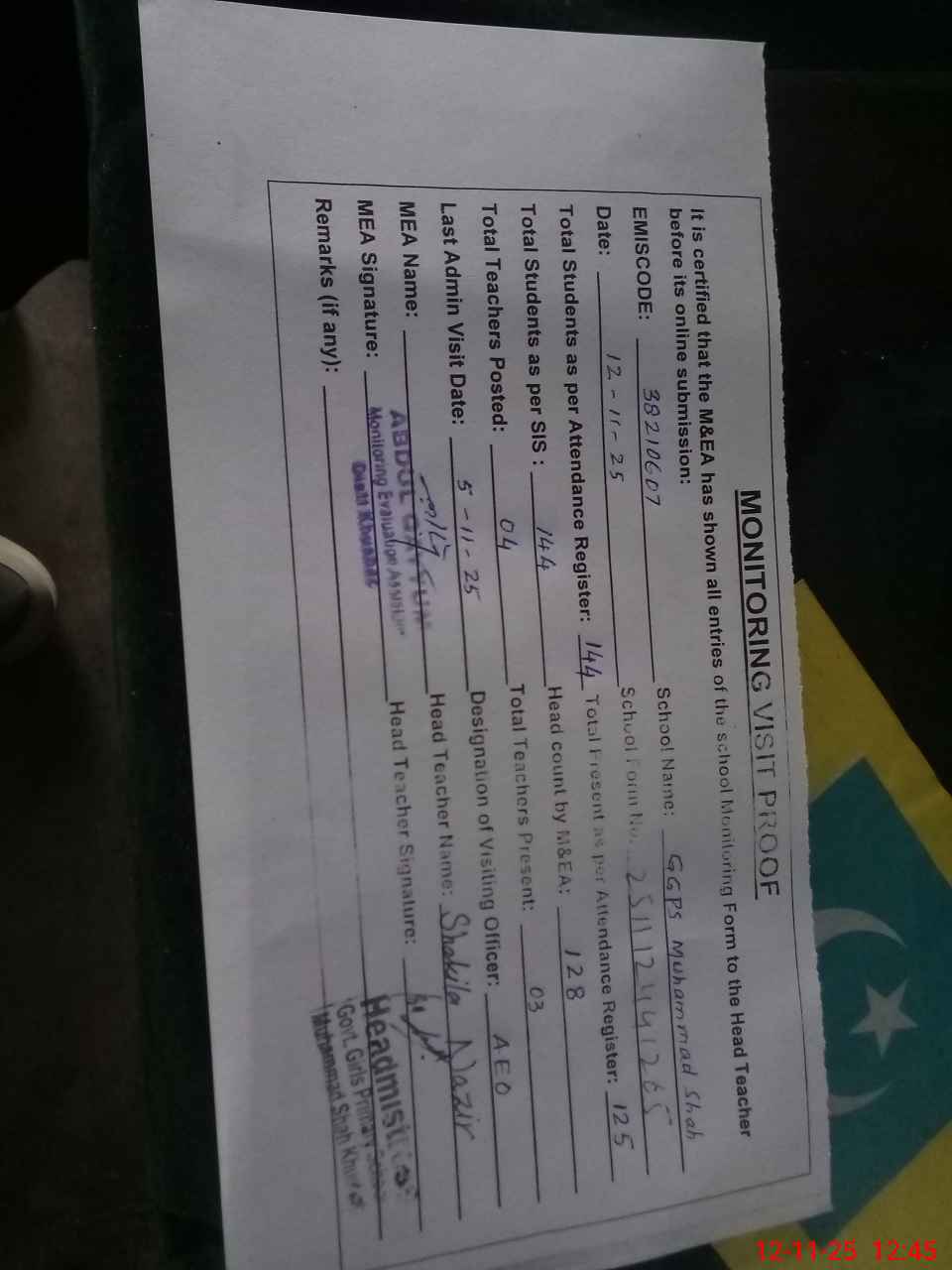 | Attendance Register | Head Teacher | MEA with School | Visit Proof |