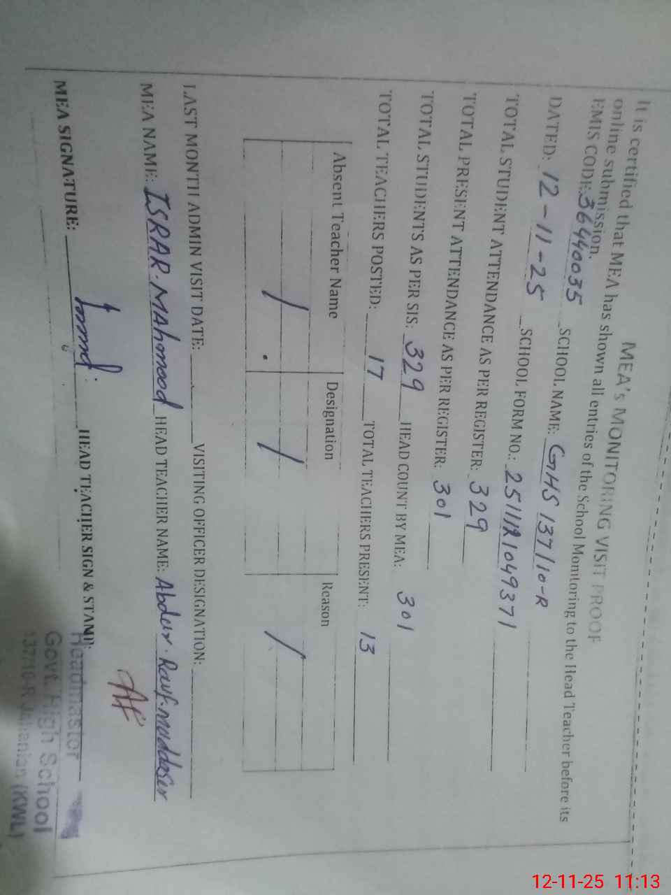 | Attendance Register | Head Teacher | MEA with School | Visit Proof |