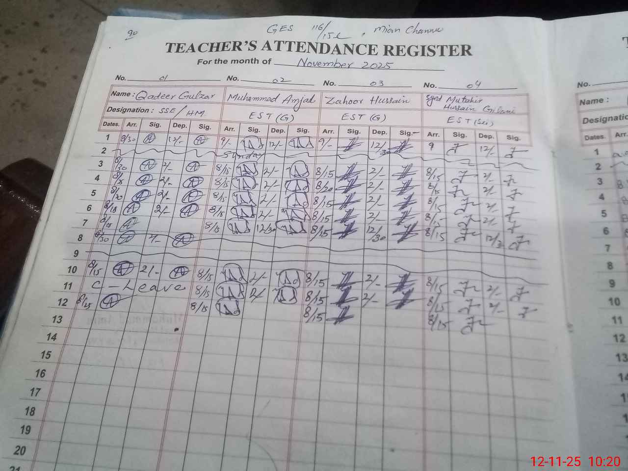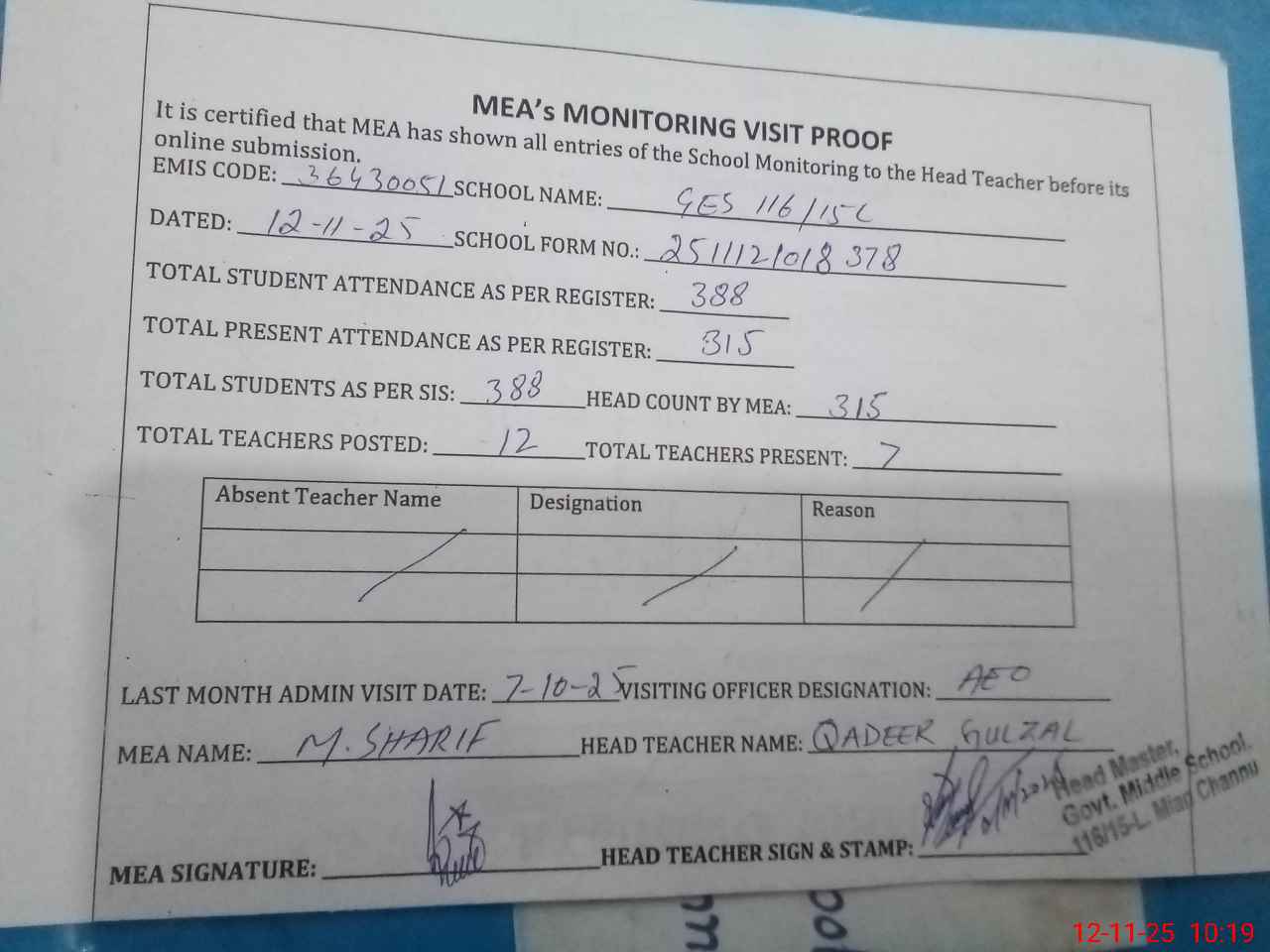 | EMIS Code: 36430051 | Name of School: GES 116/15-L, MIAN CHANNU | |||