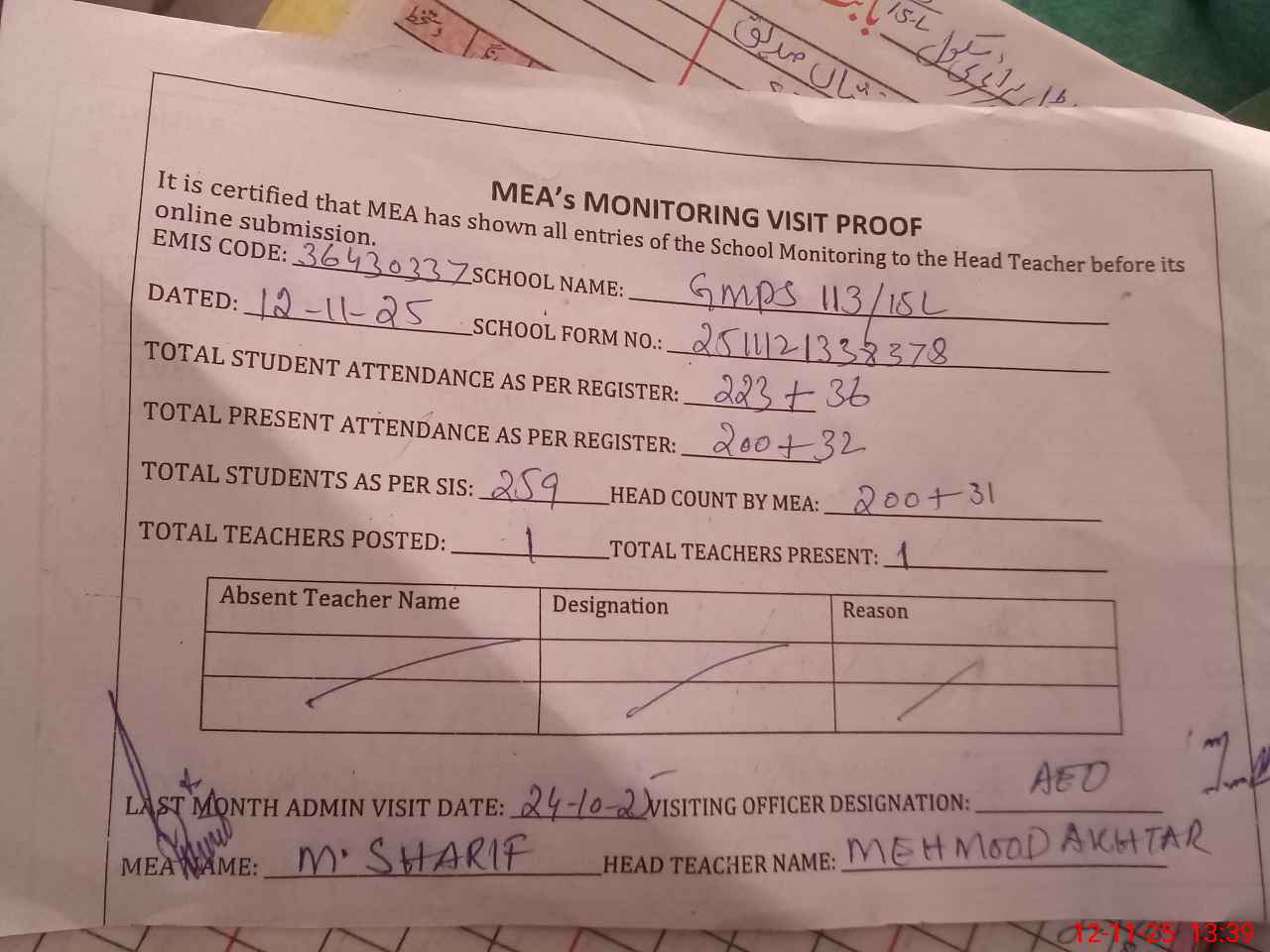 | Attendance Register | Head Teacher | MEA with School | Visit Proof |
