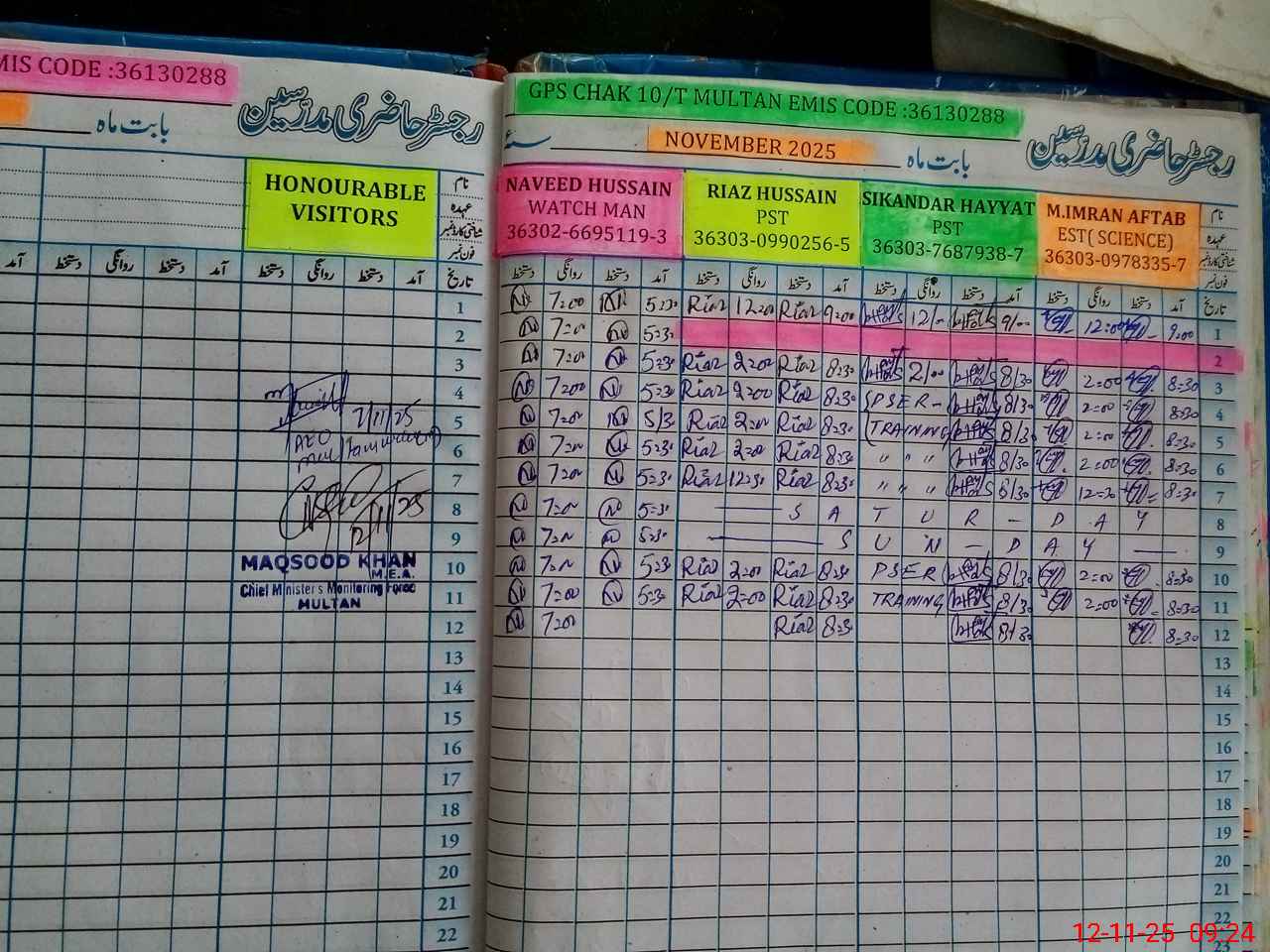 | Monitoring Date: 12-11-2025 | Start Time: 12-11-2025 09:15 AM | End Time: 12-11-2025 09:25 AM | Name of MEA: MA**** ULHA**** KH**** | |