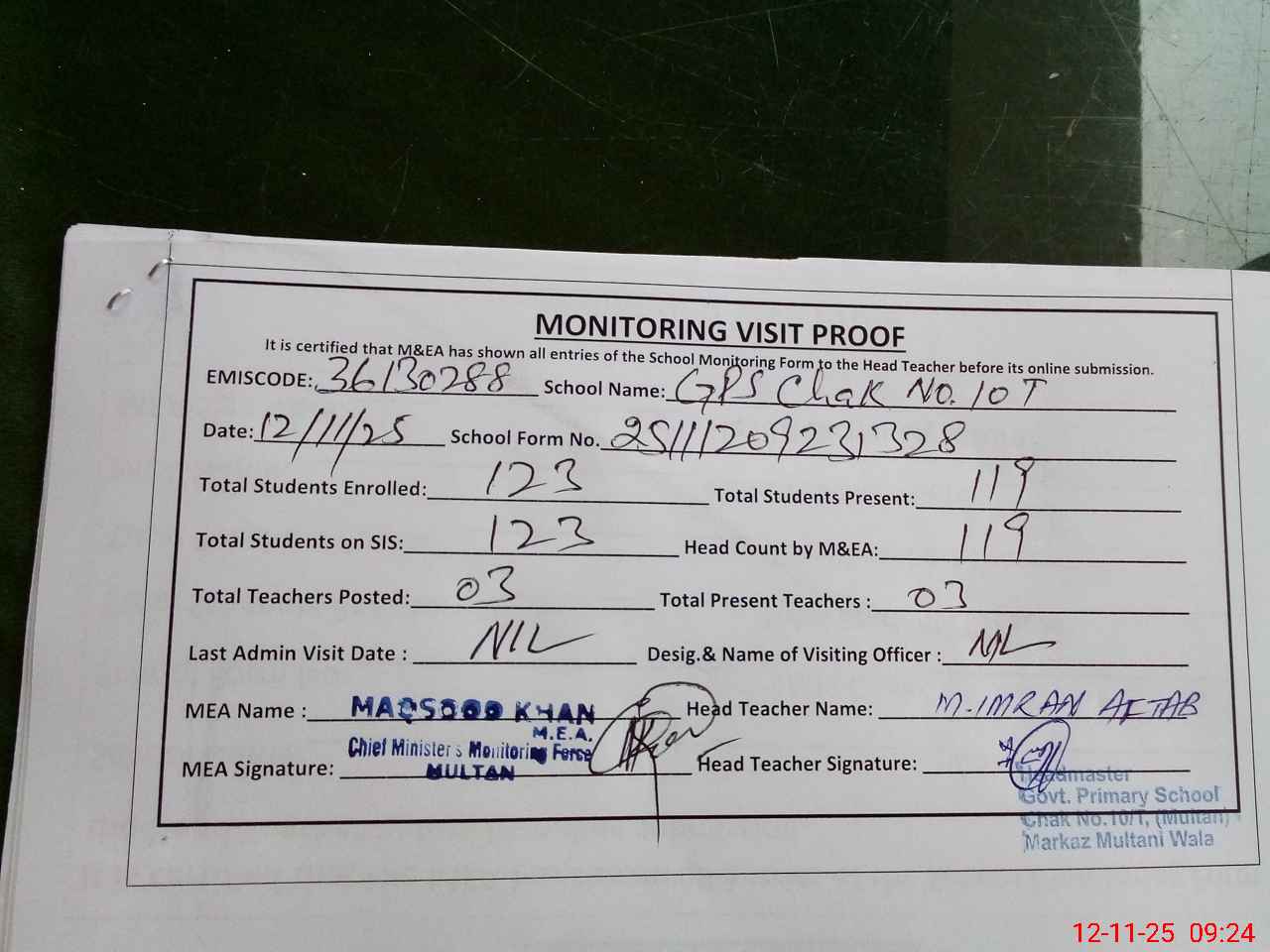| Attendance Register | Head Teacher | MEA with School | Visit Proof |