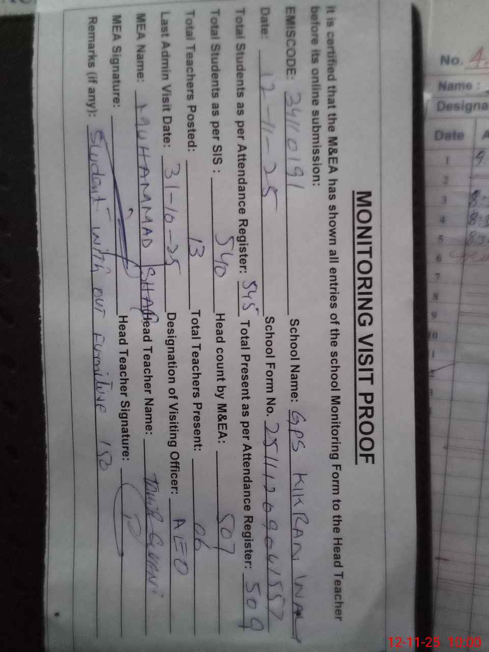 | Attendance Register | Head Teacher | MEA with School | Visit Proof |