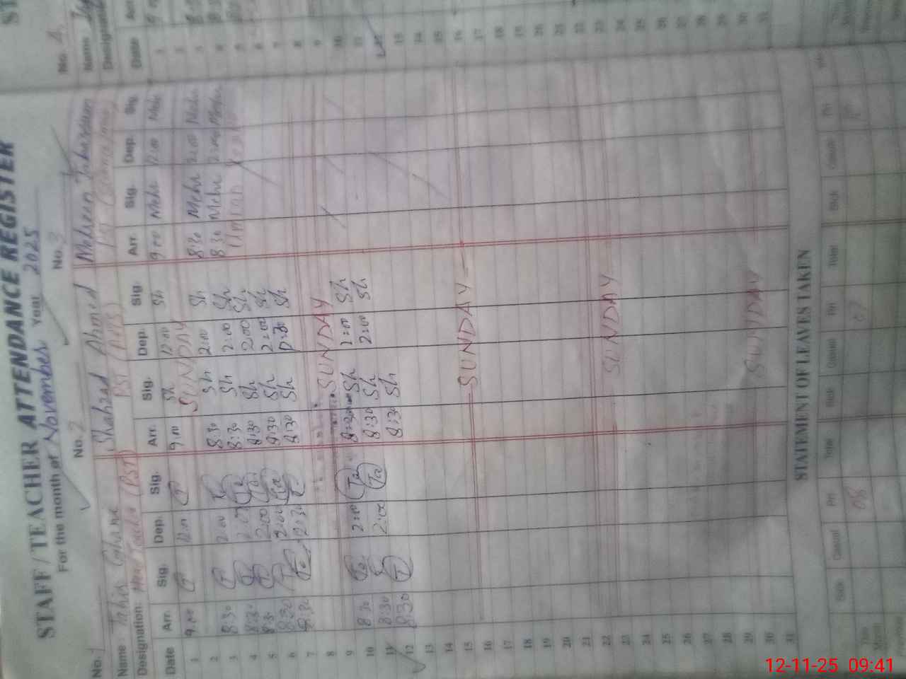 | CNIC | Full Name | Designation | R/C | Absence During Last Calender Month |